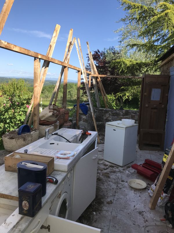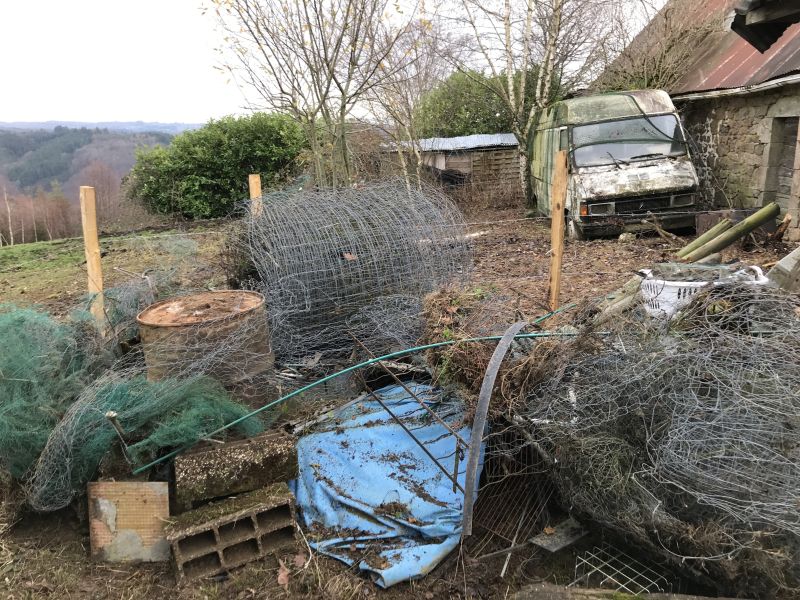 Ce qui ressemblait autrefois à une véritable décharge est aujourd’hui un espace maîtrisé et harmonieux. Pendant des décennies, rien n’était évacué : tout s’accumulait sur la propriété. En 2018, l’état des lieux était difficile à imaginer pour qui ne l’a pas vu : remorque abandonnée, pneus empilés, carcasse de caravane, vieux camion, tas de ferraille… Des fils de fer, du verre brisé, plusieurs bacs de douche, un aquarium… Difficile de dresser un inventaire exhaustif mais les photos parlent d’elles même. Nous ne comptons plus les fois où nos pneus de remorque, de tondeuse ont été perçés.