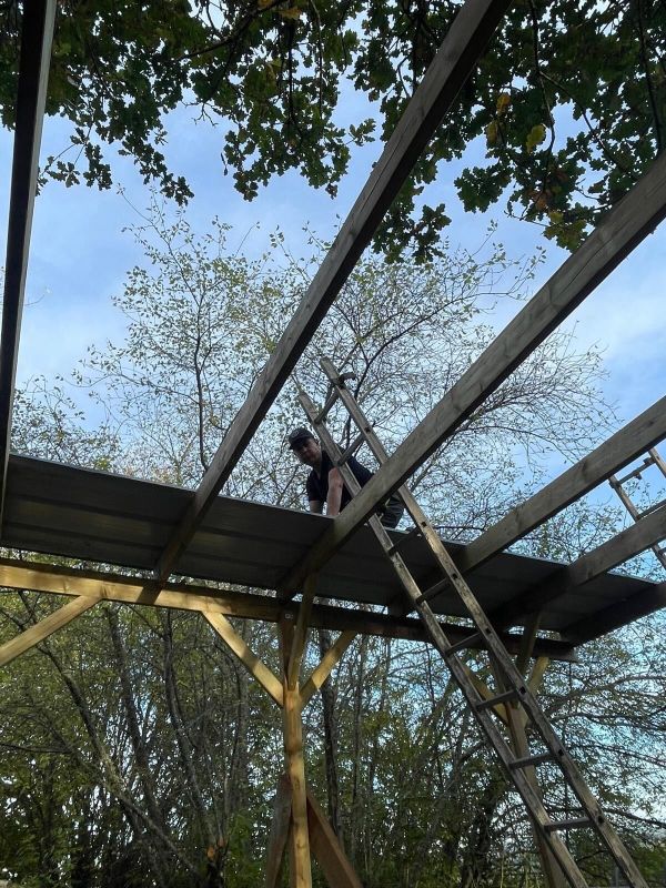 Ensuite, le montage de l’appentis s’est déroulé avec l’aide précieuse de mon ami Vincent. L’appentis a été achevé fin octobre 2025 et offre désormais un abri sécurisé pour la caravane vintage ainsi qu’un autre véhicule.