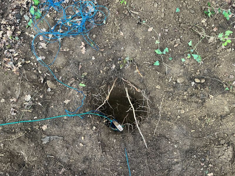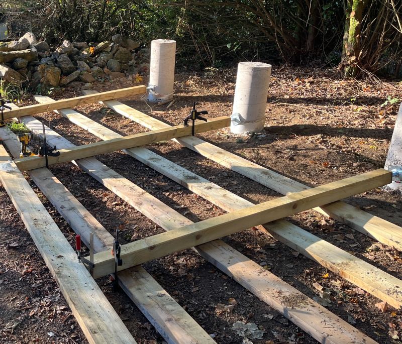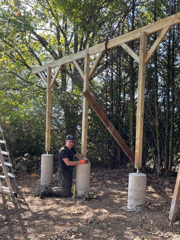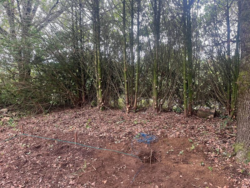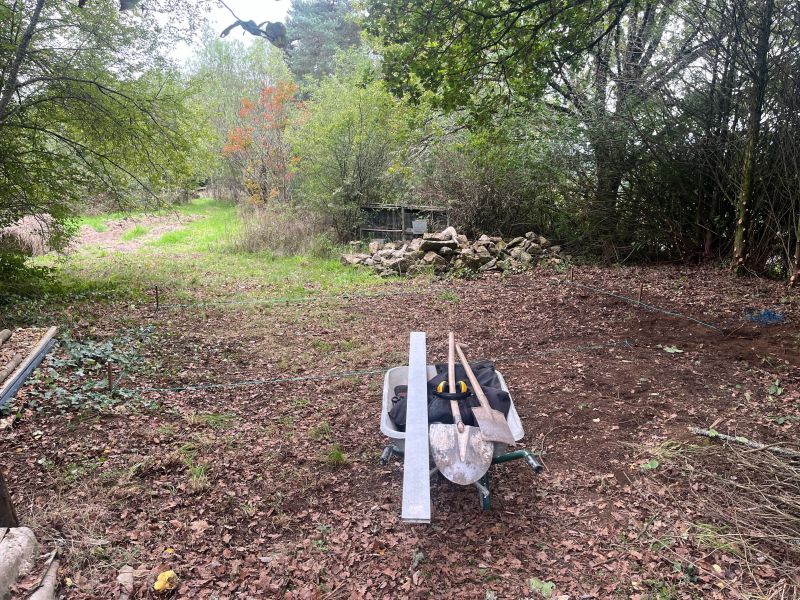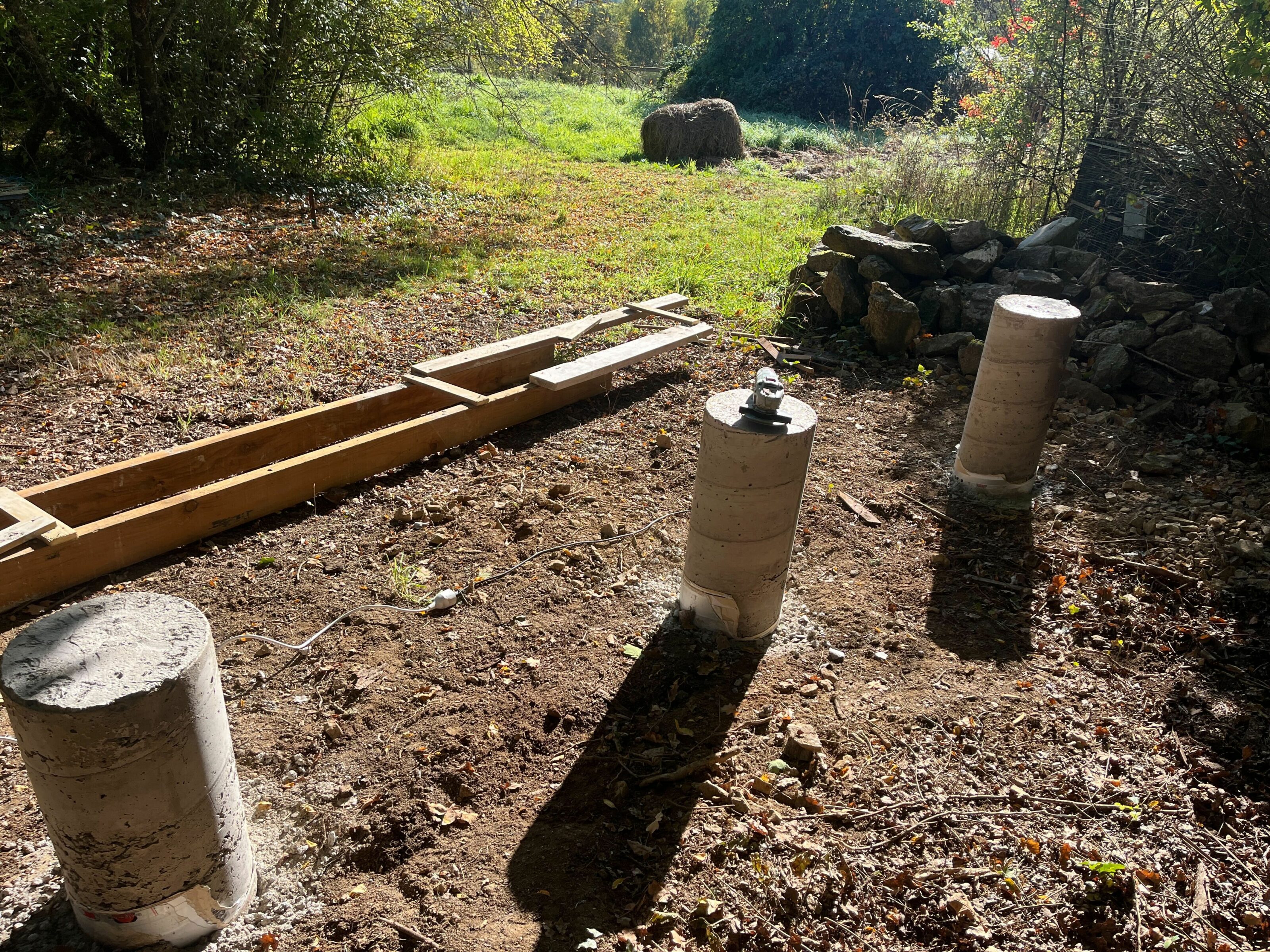En septembre et octobre 2025, une importante phase de préparation a eu lieu : nettoyage du terrain, prise de mesures, réalisation des trous pour les fondations à l’aide d’une tarrière thermique (que je recommande vivement). Les fondations ont été façonnées en forme cylindrique grâce à des colonnes en papier recyclé.