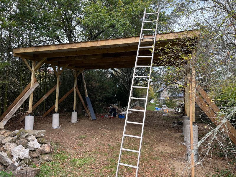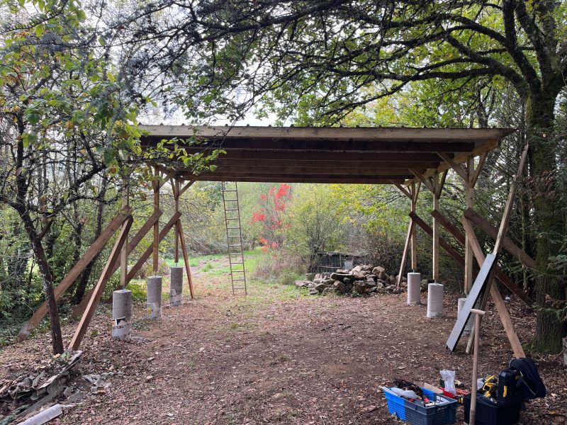À partir de là, j’ai commencé à réfléchir à un projet ambitieux : un grand appentis-hangar évolutif, pensé pour durer et s’adapter aux besoins futurs. Projet fait à l’économie à partir d’un car port disponible sur france abris, double car port qu’il fallait réhausser avec des plots et des tôles de bac acier de récupération.